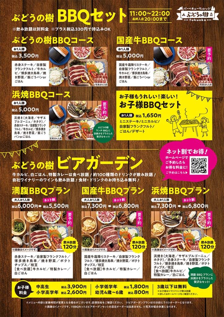 BBQビレッジ 2026年3月14日より営業再開!(~11/30まで)ご予約スタート! 2026 3/06 お知らせ 2026年3月6日 春も近づき、いよいよBBQビレッジぶどうの樹FUKUOKAも営業を3月14日より再開します。 買ってきた食材をお持ち込みでBBQを楽しんだり、ぶどうの樹の人気BBQセットで気軽にBBQしたり、もちろん今年もビアガーデン形式で飲み放題プランもございます。 今年もBBQビレッジぶどうの樹FUKUOKAをどうぞよろしくお願いいたします。 オンライン予約はこちら お知らせ 12月1日~3月13日は冬季休業期間となります